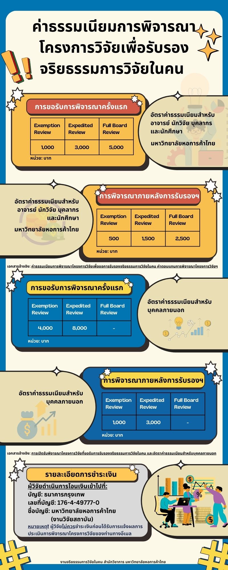 - ค่าธรรมเนียมการพิจารณาจริยธรรมการวิจัยในคน [PDF][JPG]